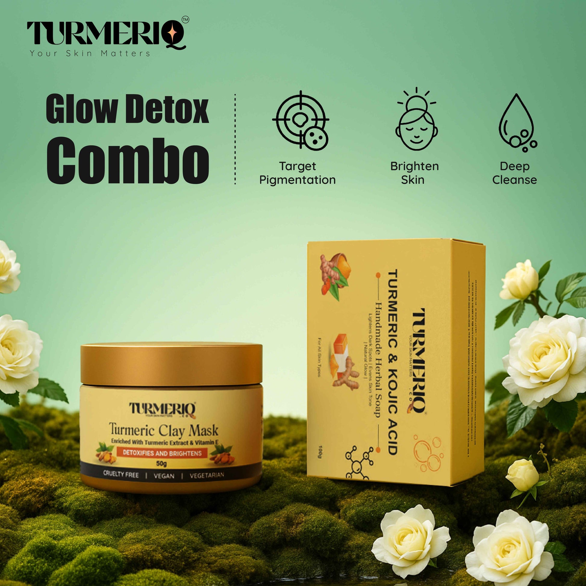 The Turmeriq Brightening Duo combines our creamy Turmeric & Kojic Acid Soap Bar with pre-soaked cleansing pads to deliver a two-step brightening ritual: the soap bar gently dissolves dirt and excess oil while infusing skin with curcumin and kojic acid to inhibit melanin production, then the exfoliating pads sweep away dead cells and boost absorption of antioxidants and humectants—leaving skin deeply cleansed, evenly toned, and visibly radiant