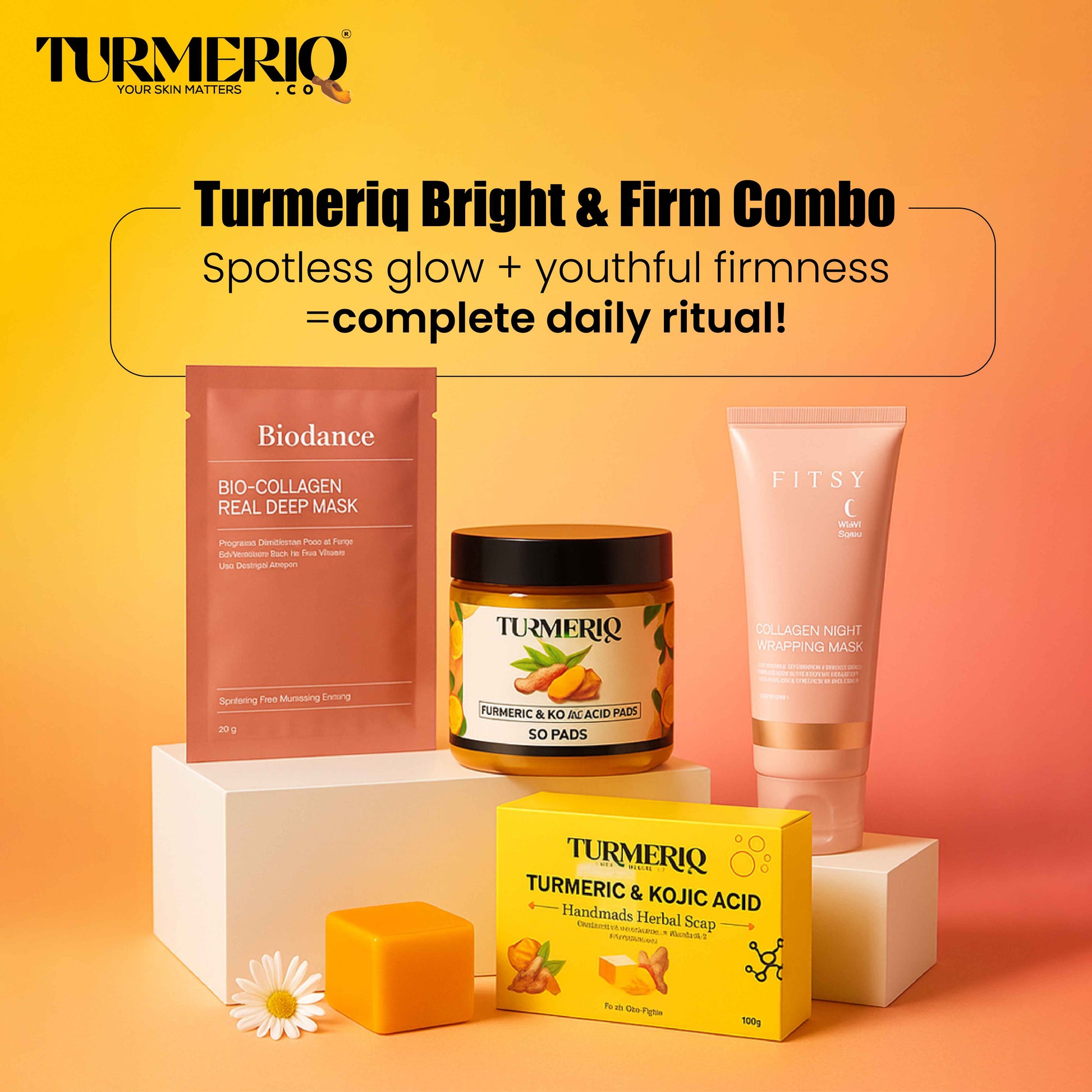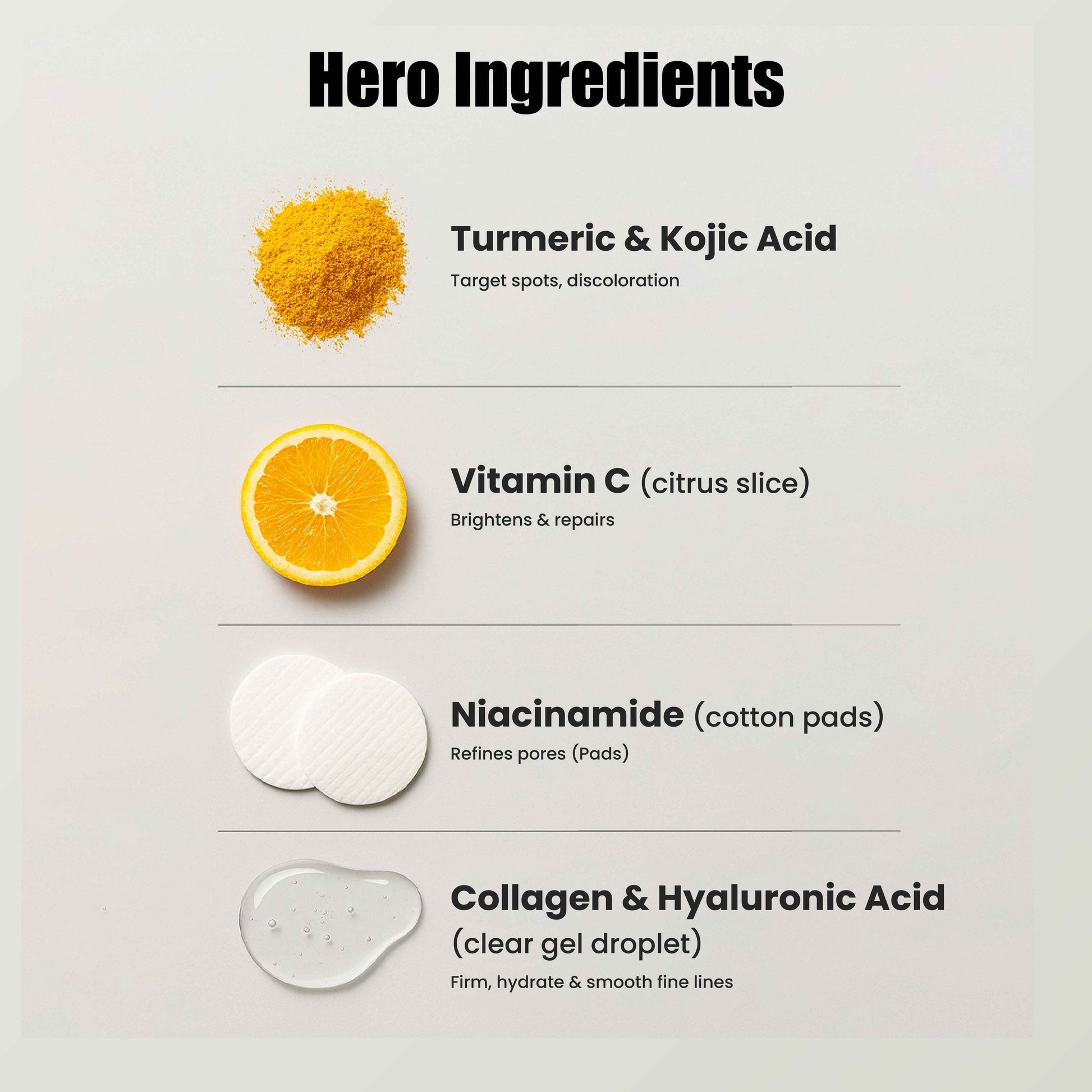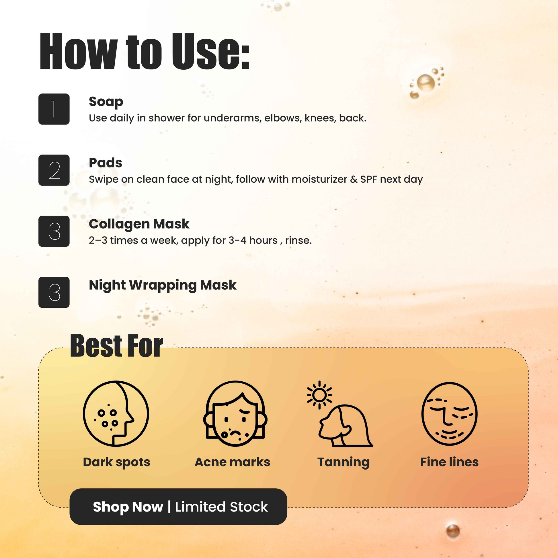 A 4‑step regimen that gently exfoliates and brightens with turmeric‑kojic acid pads and soap, then deeply hydrates and firms skin day and night with collagen masks to reduce dark spots, smooth fine lines and reveal a youthful glow.